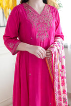 Elegant Pink Viscose Chanderi Embroidered Top with Bottom and Printed Chanderi Dupatta